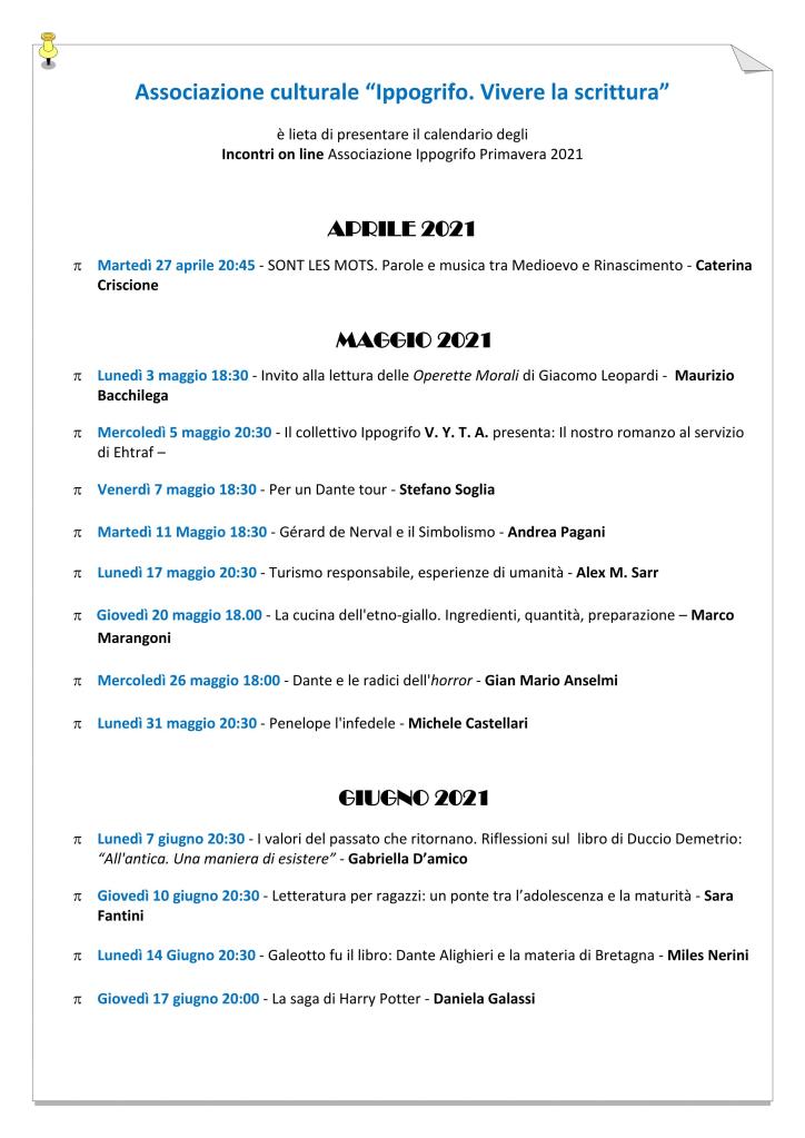 L’associazione “Ippogrifo. Vivere la scrittura”, assai attiva da 5 anni con eventi e iniziative culturali di alto livello, propone un meraviglioso calendario di incontri online per la primavera 2021.