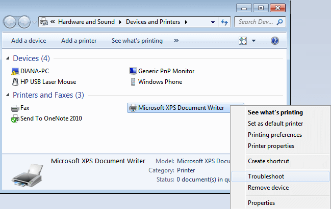 - Identifica le stampanti disponibili, seleziona quella problematica, fai clic con il pulsante destro del mouse su di essa e quindi seleziona Risoluzione dei problemi (come nell’immagine seguente).