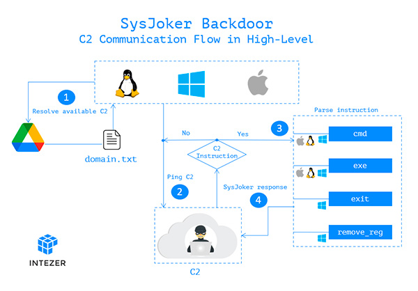 Le infezioni avvengono non mediante lo sfruttamento di una vulnerabilità del sistema operativo ma con un attacco simile a quello dei comuni trojan, mascherandosi da software innocui. Su macOS invece il malware assume l’aspetto di un file video. SysJoker è scritto in C++, la backdoor genera l’indirizzo del server di controllo, andando poi a decodificare una stringa recuperata da un file di testo che è conservato su Google Drive. Il creatore del malware può dunque monitorare le macchine colpite dalla minaccia per poi agire in remoto.