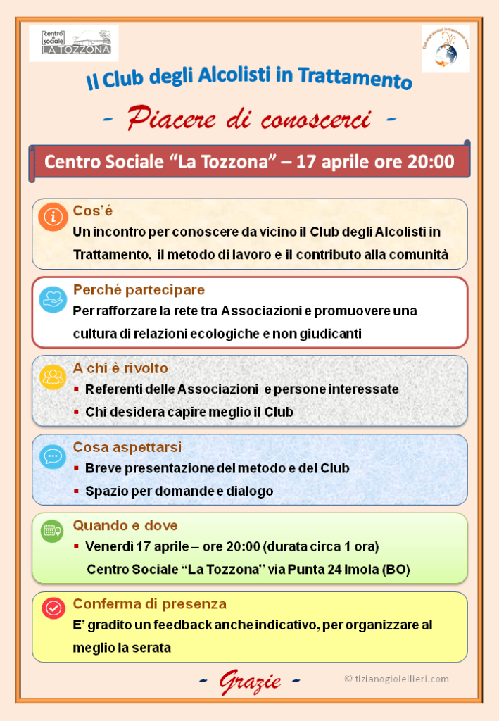 “Il Centro sociale La Tozzona e il Club degli Alcolisti in Trattamento: Piacere di conoscerci”, che si terrà venerdì 17 aprile alle ore 20:00 presso la Sala “2” in Via Punta 24 a Imola